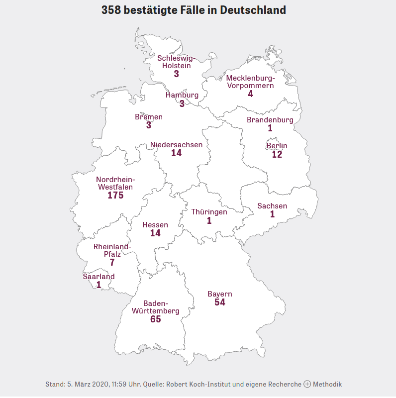 In dieser Karte sind alle Corona-Fälle dargestellt, die von der Behörde offiziell geprüft und bestätigt worden sind. Zugeordnet werden sie den Bundesländern, in denen die infizierten Personen wohnen. Darüber hinaus recherchiert ZEIT ONLINE täglich selbst nach Fällen, die neu hinzukommen und möglicherweise erst am kommenden Tag in die Statistik des RKI aufgenommen werden. Deshalb können die hier gezeigten Zahlen von den Angaben der Bundesbehörden oder anderen Medien abweichen.