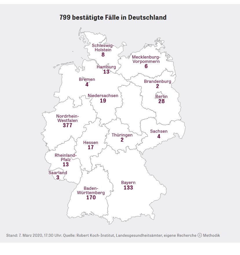 Innerhalb von 2 Tagen haben sich die Coronafälle in Deutschland auf 800 verdoppelt. Bisher kein Todesfall.
