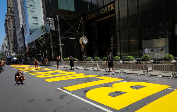 Die Stadt New York hat in Großbuchstaben das Anti-Rassismus-Motto „Black Lives Matter“ auf die Straße vor dem Trump-Tower in Manhattan gemalt. Auch Bürgermeister Bill de Blasio und seine Frau Chirlane McCray beteiligten sich an der Aktion.